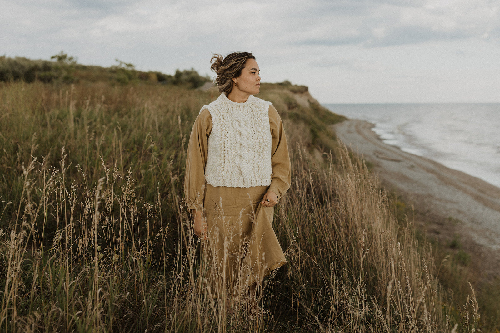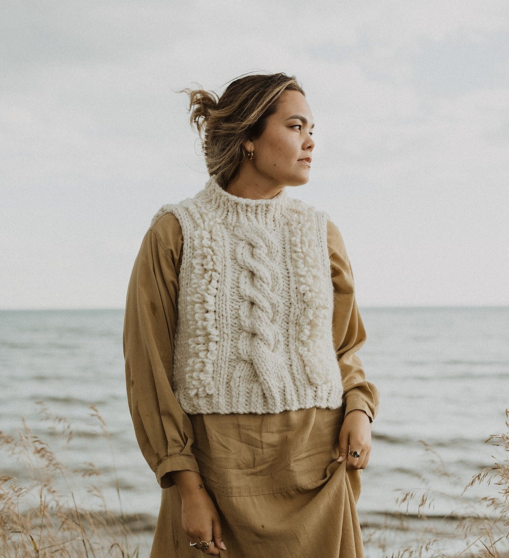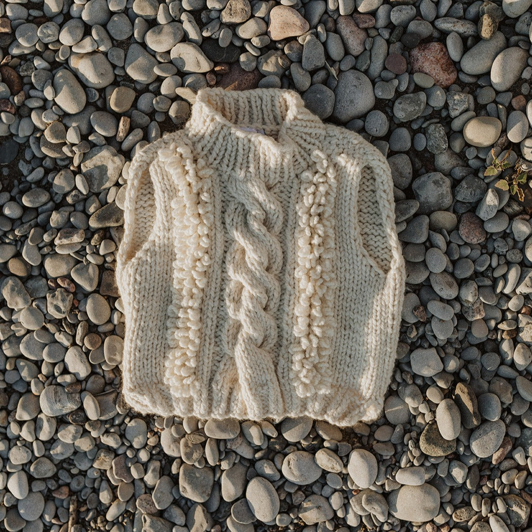 Reminiscent of traditional cable knit vests, intricately handknit from the softest merino/ alpaca mix.