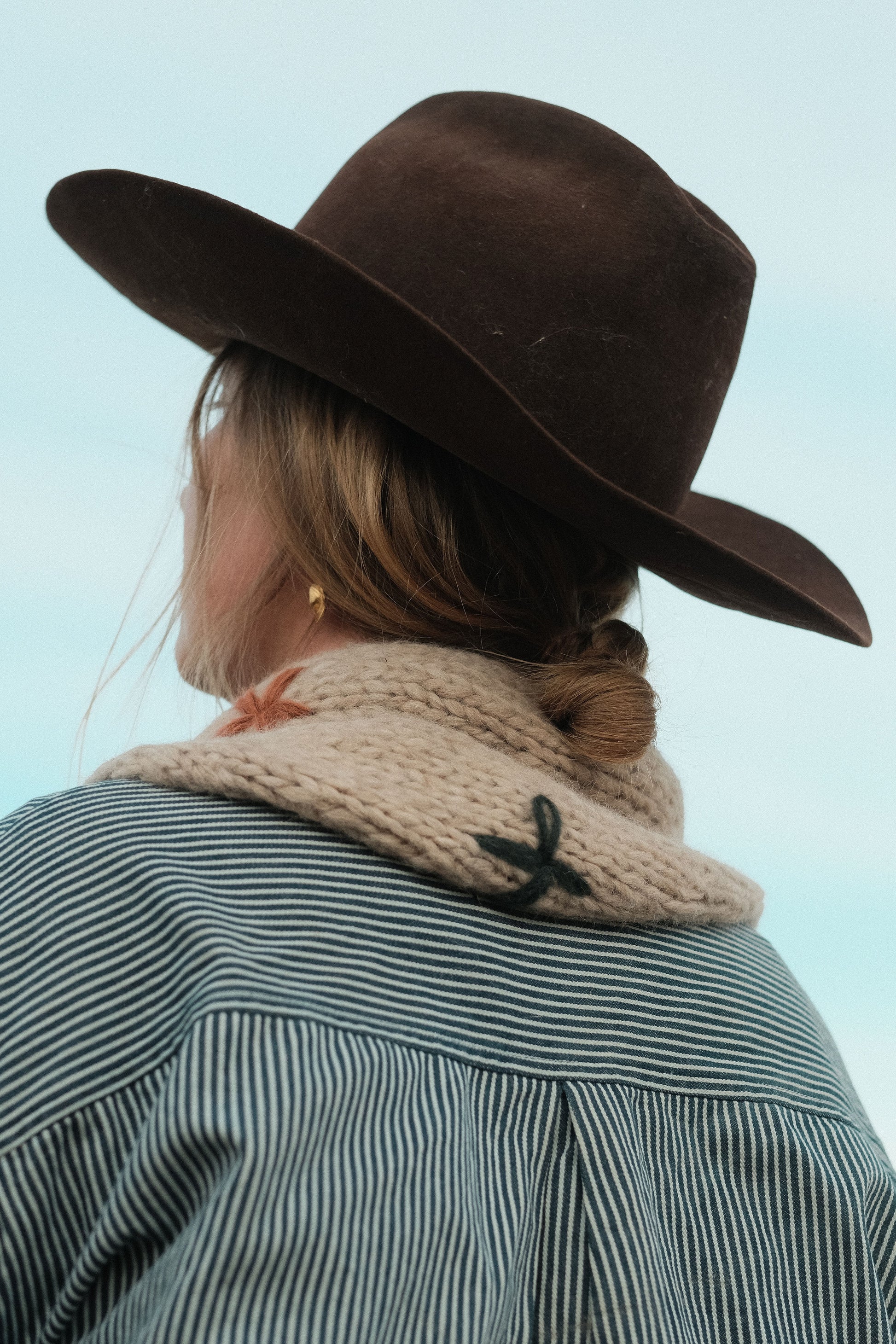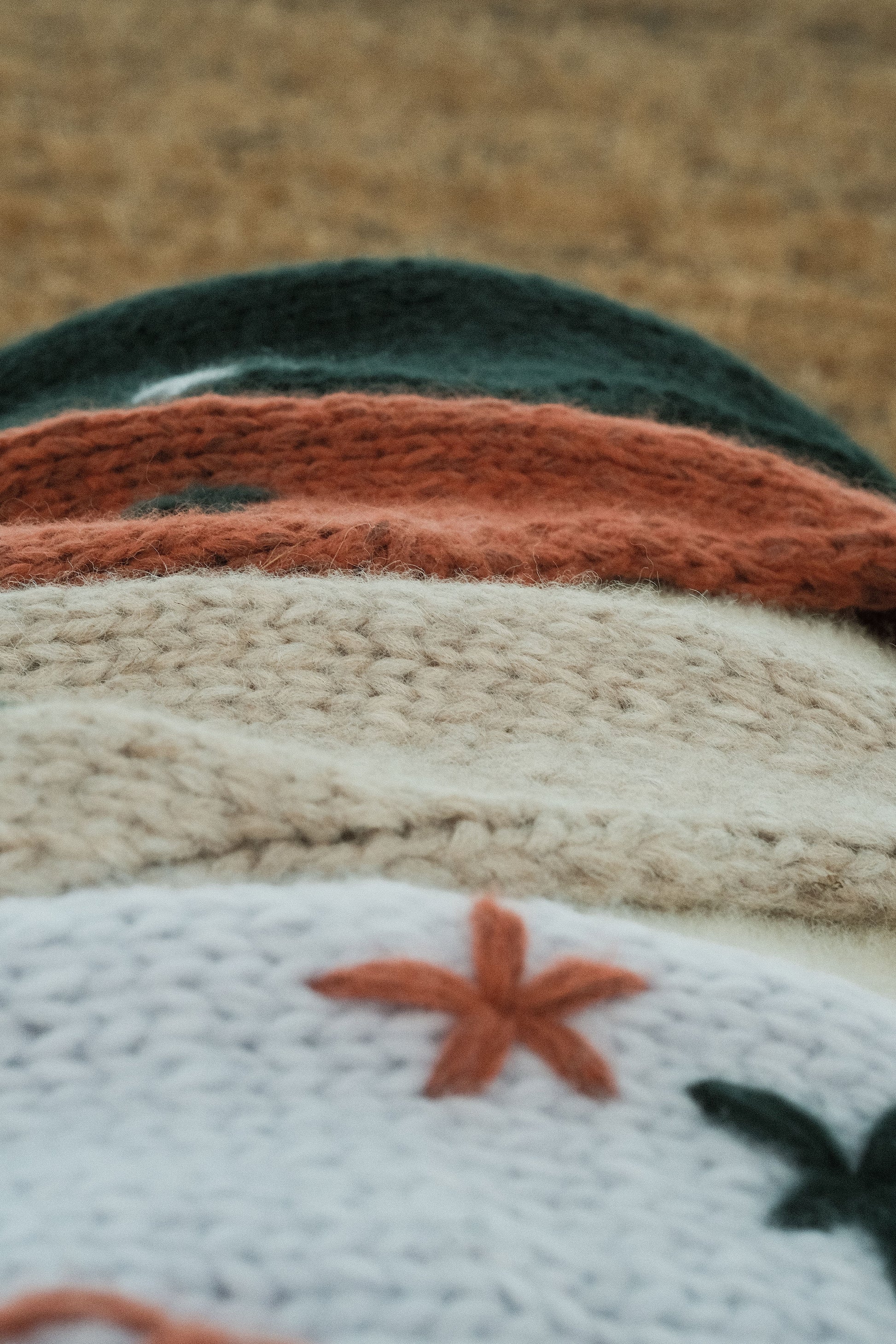 Handknit fluffy bandana headscarf with embroidered floral motif.