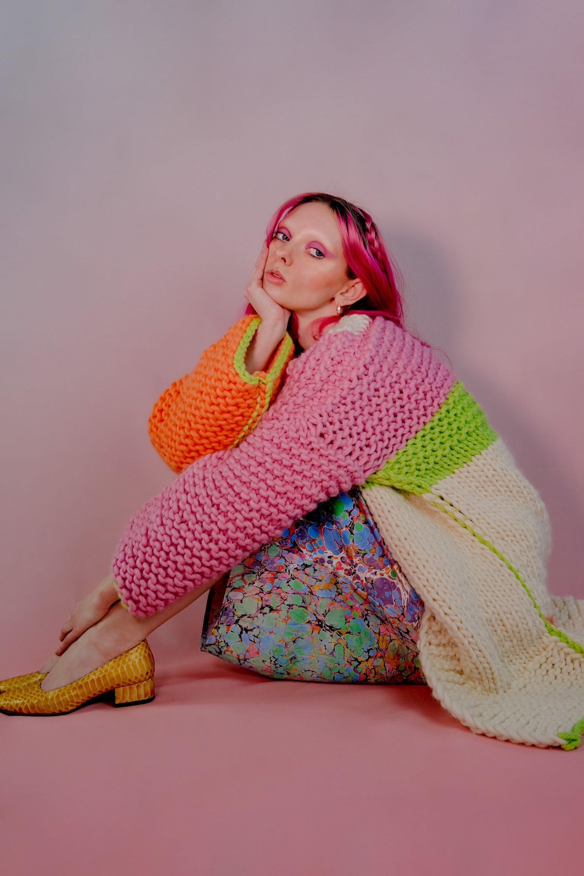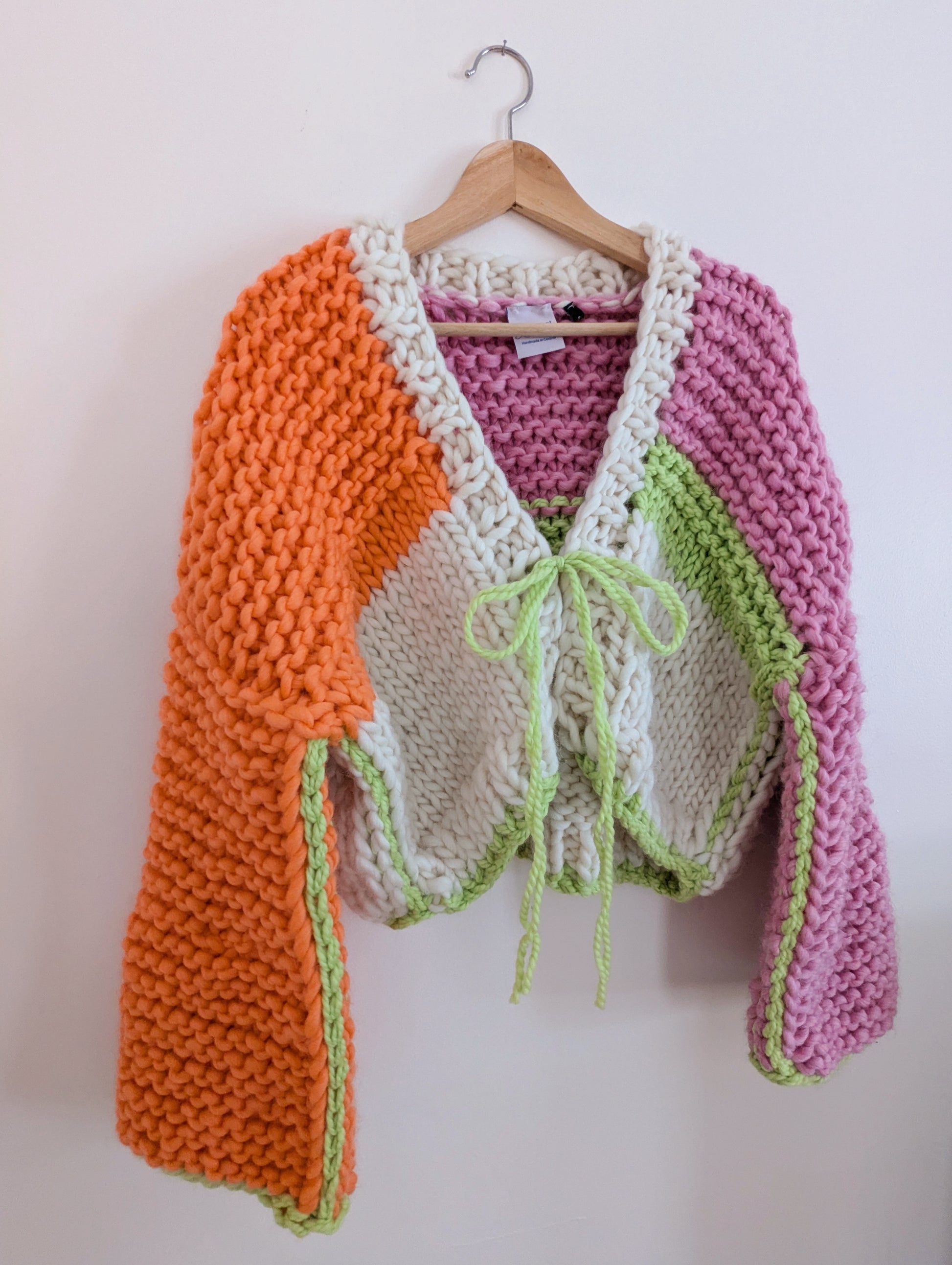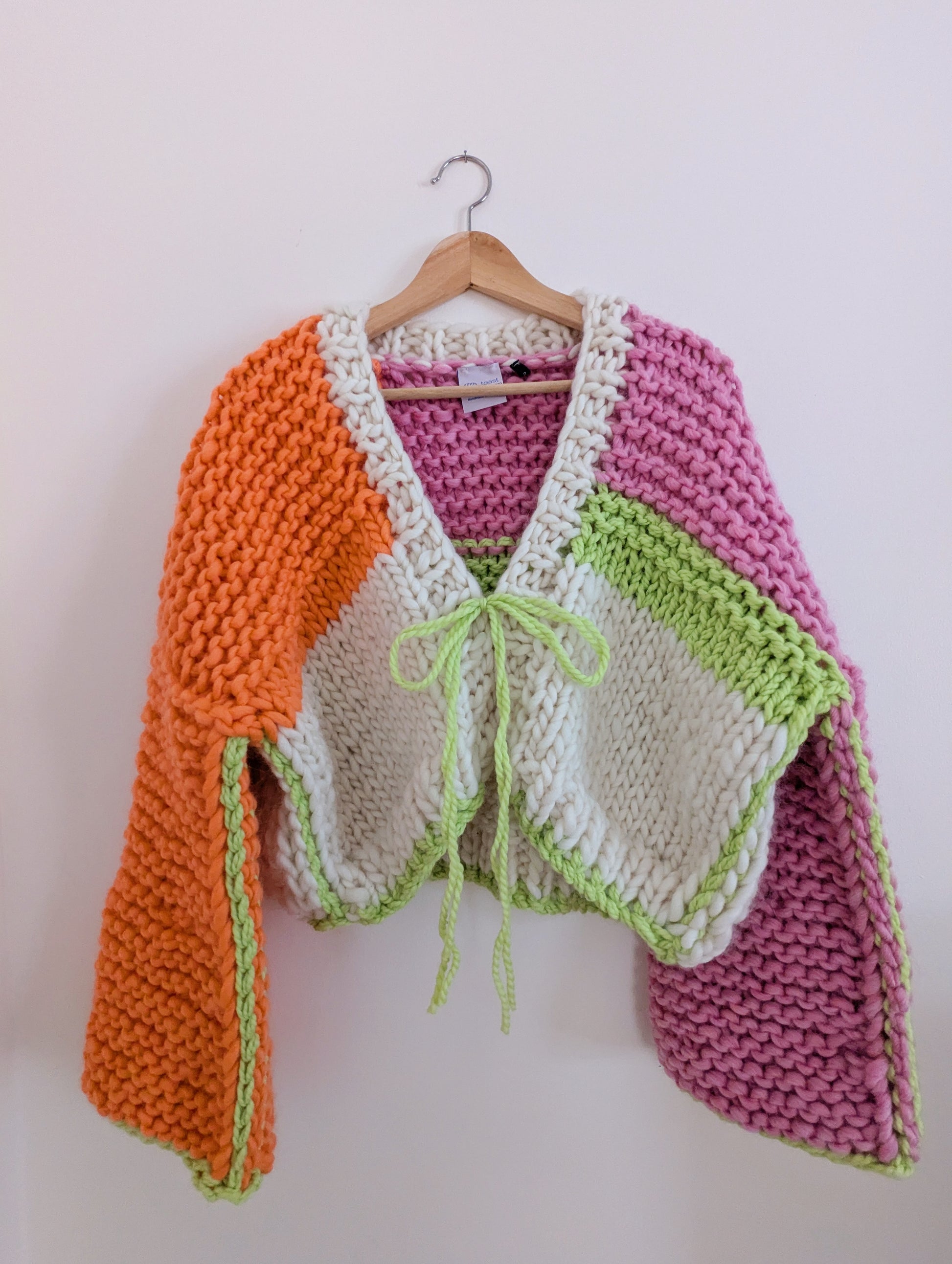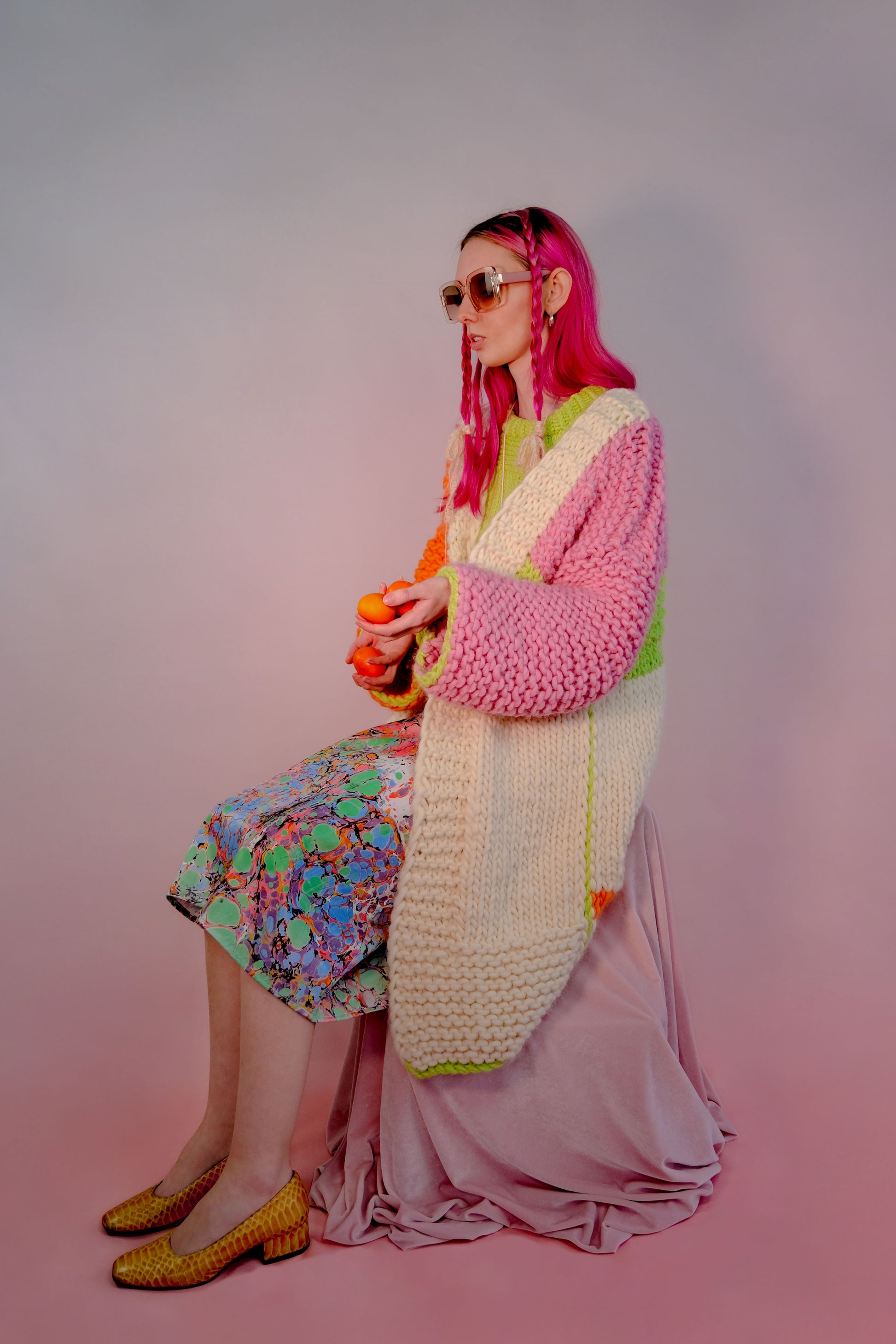 In sherbet colours, this chunky knit is perfect for spring strolls around the neighborhood.