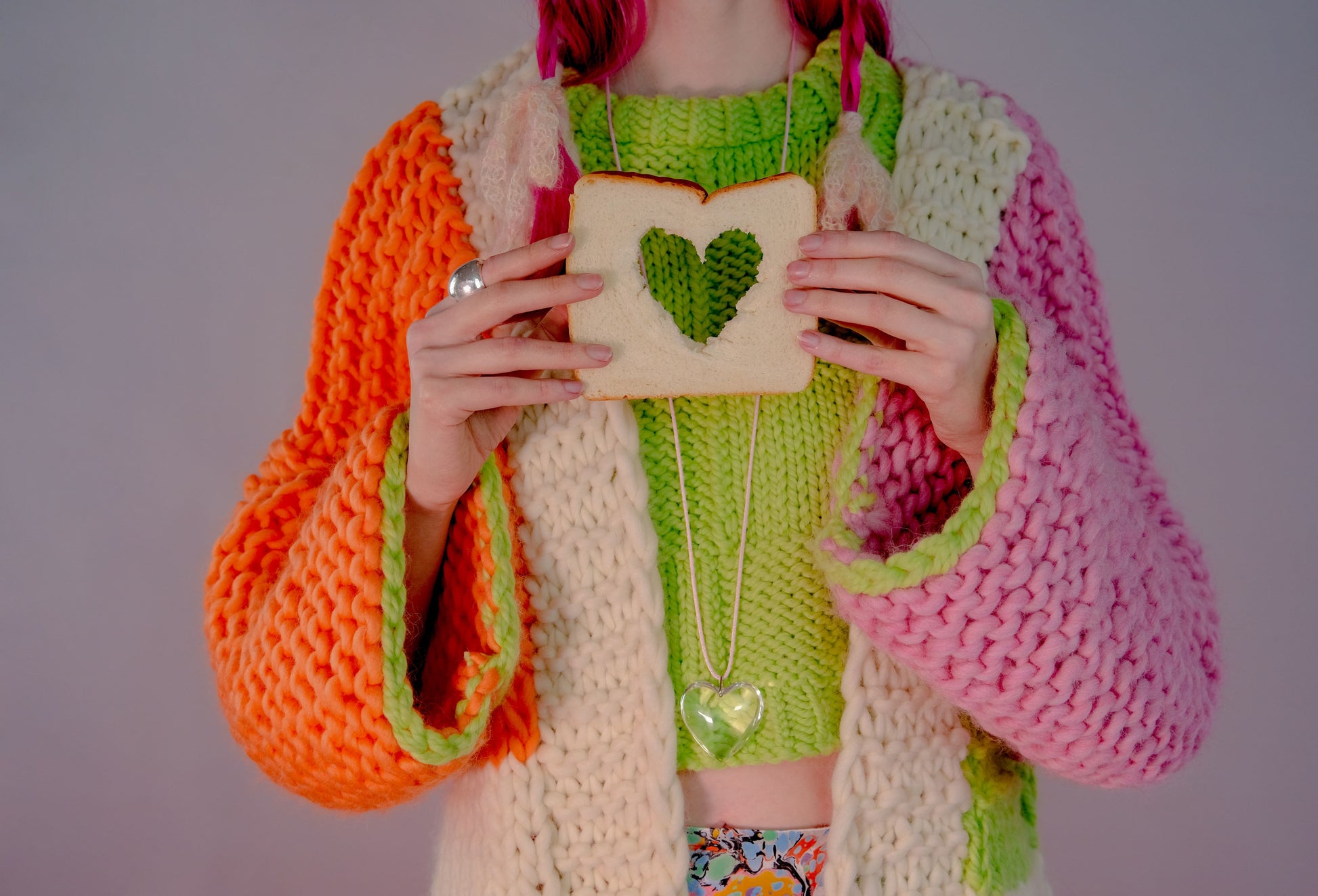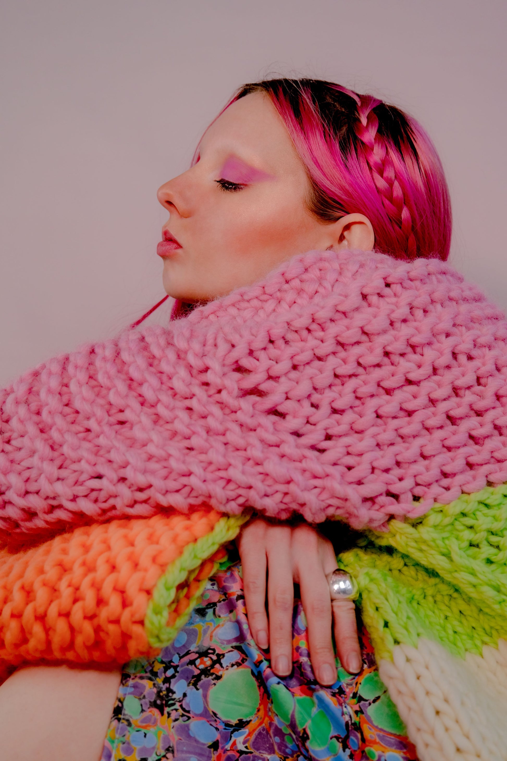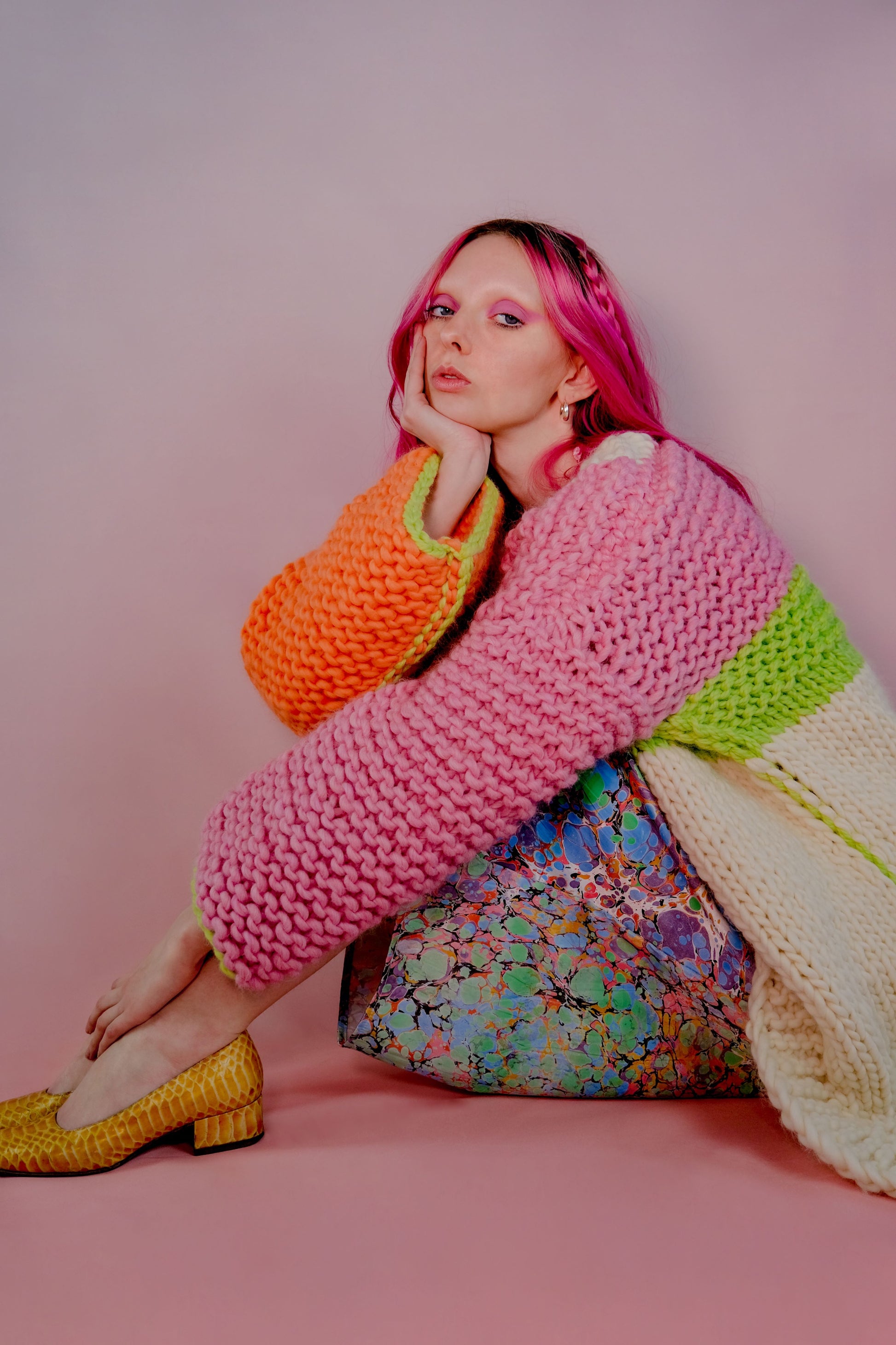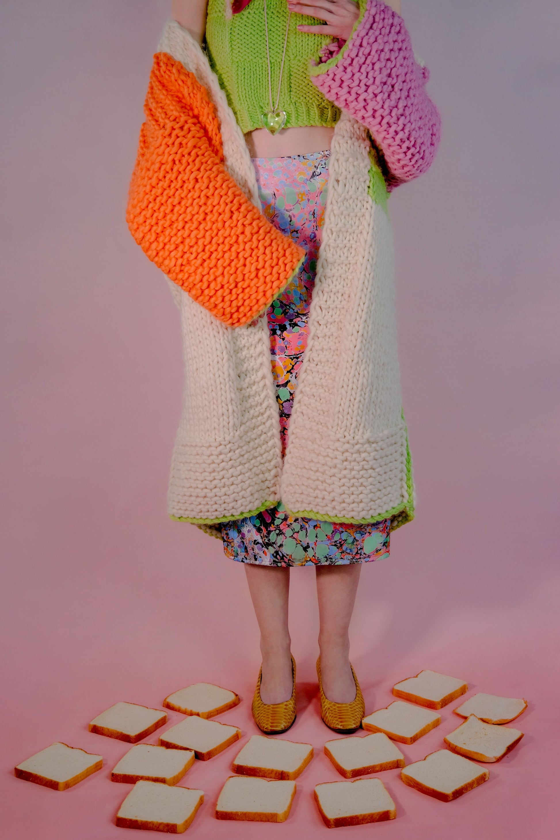 In sherbet colours, this chunky knit is perfect for spring strolls around the neighborhood.