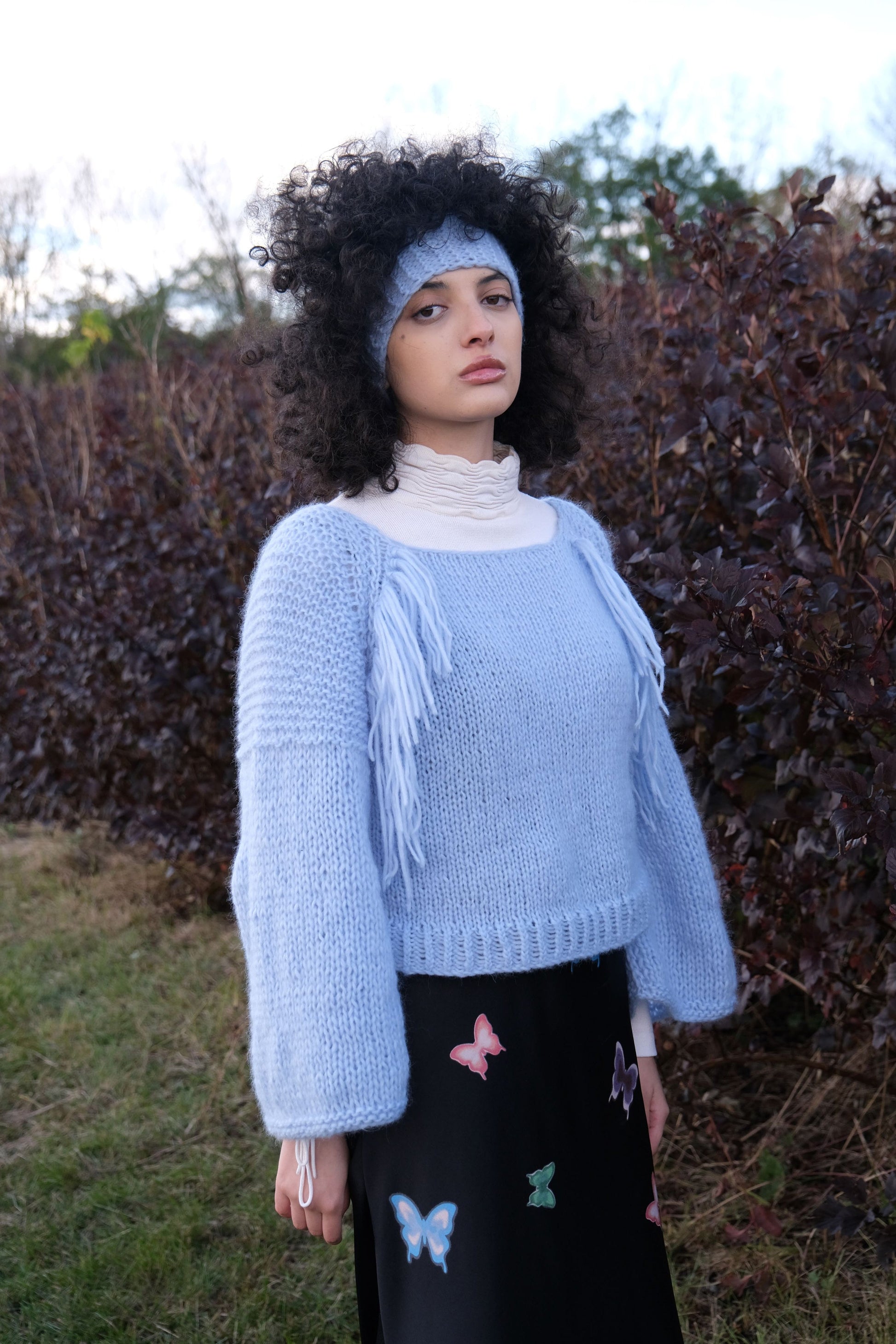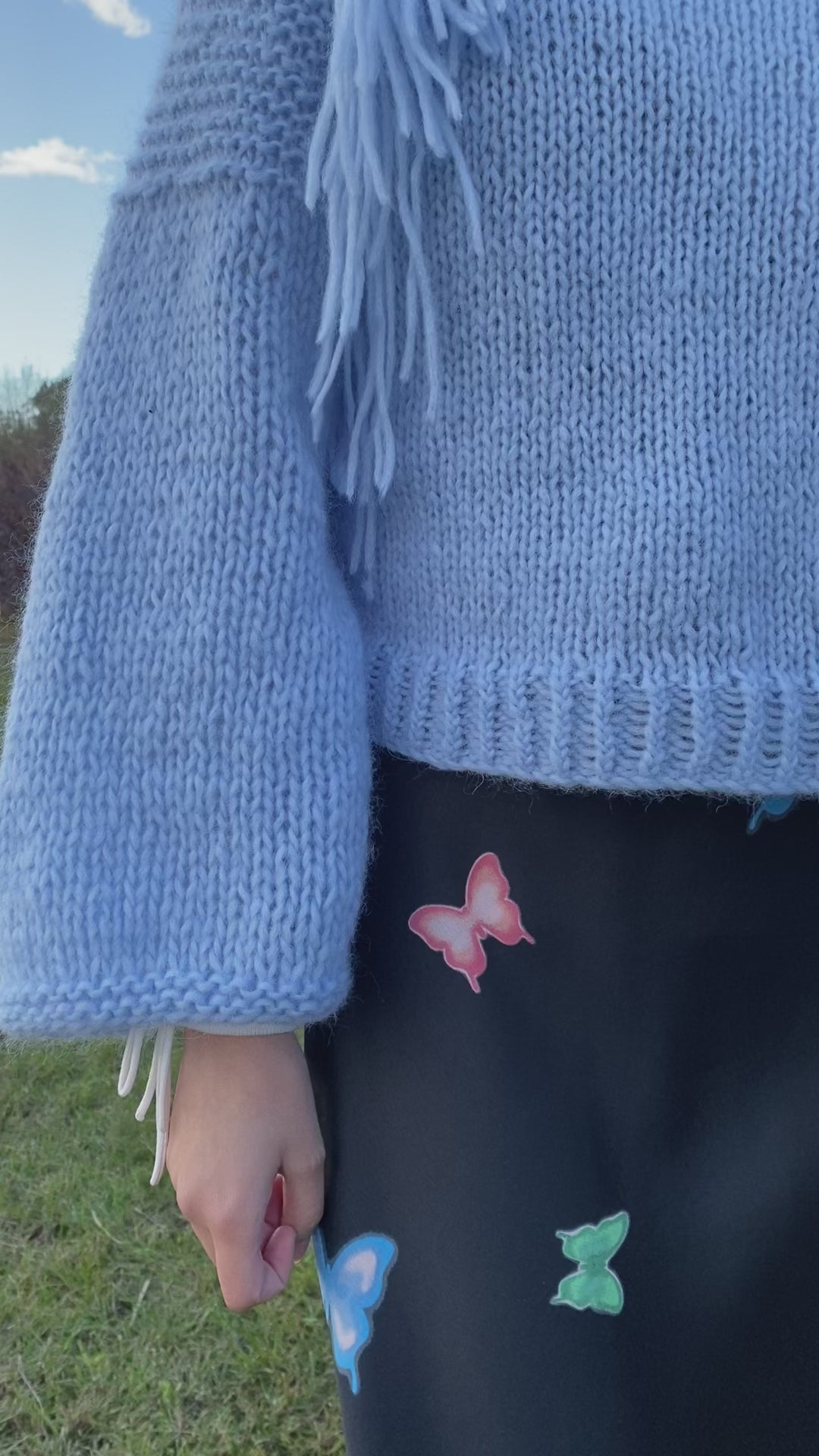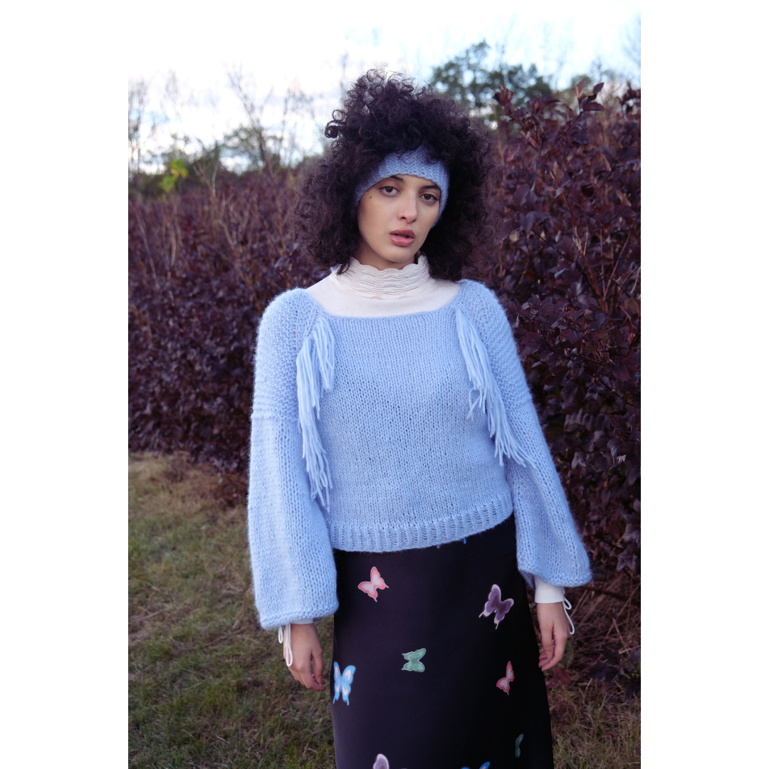 New! Super lightweight and warm, our fluffiest sweater yet. Western-inspired fringe detailing in a soft sky blue.